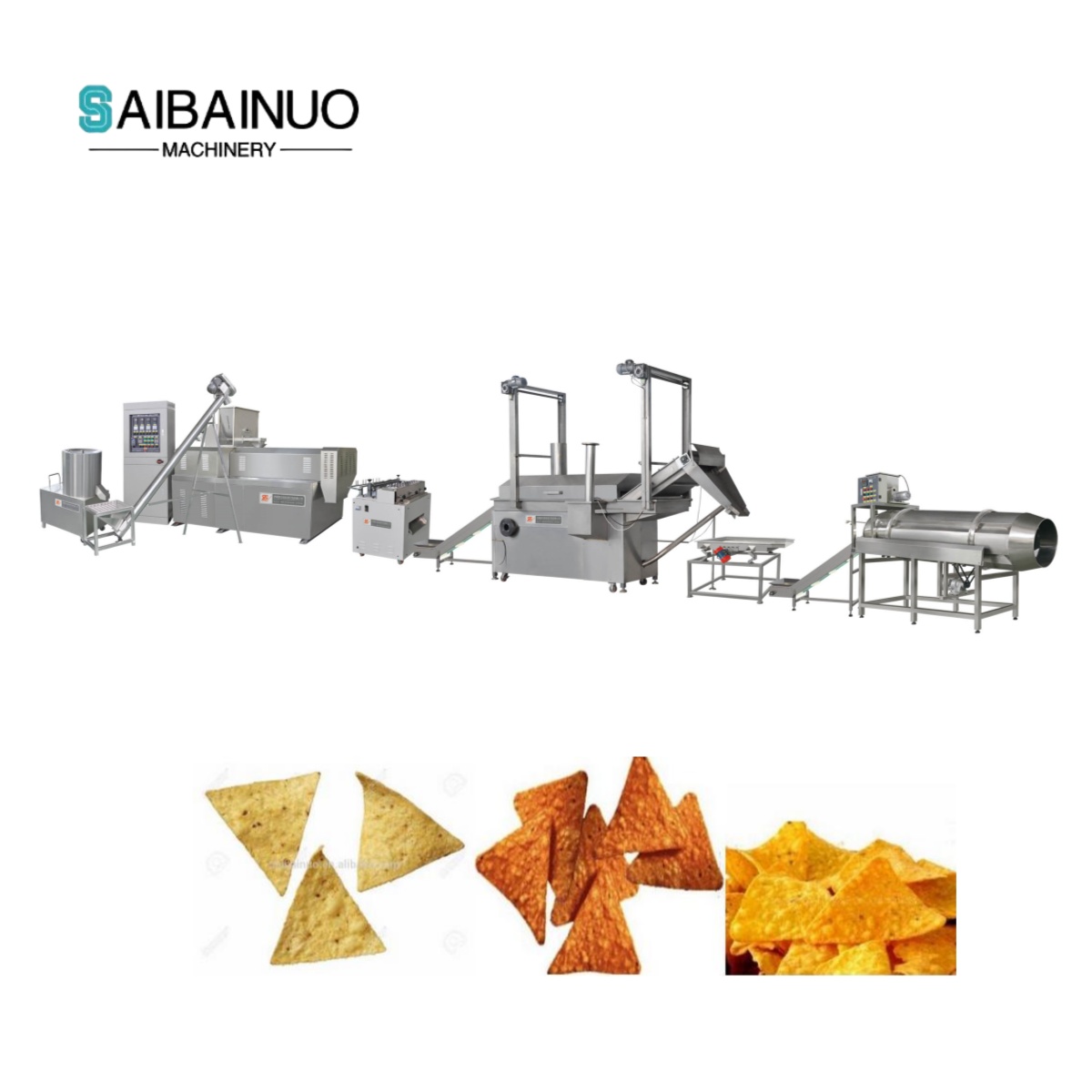 La machine à extrudeuse Doritos Chips utilise la farine de maïs comme matière première pour produire des aliments Doritos Chips de haute qualité. Il peut produire diverses formes telles que Round et Triangle. La ligne de machine utilise une extrudeuse à deux vis à haute température et une pression et une friteuse continue avec une faible consommation pour produire les copeaux de tortilla. La ligne de machine est accueillie par les clients et exportée vers de nombreux pays.