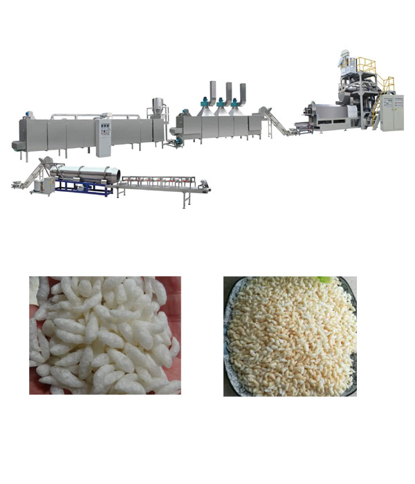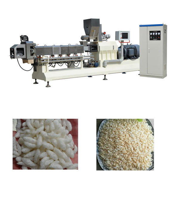 Ingrédients: Vous aurez besoin de la farine de riz, de l'eau et des arômes ou des assaisonnements supplémentaires si vous le souhaitez. 2. Préparer l'extrudeuse: assurez-vous que l'extrudeuse à deux vis est propre et correctement installée en fonction des instructions du fabricant. Réglez la vitesse de vis et les réglages de température au besoin. 3. Mélange: Mélanger la farine de riz avec de l'eau pour former une consistance en forme de pâte. Si vous ajoutez des arômes ou des assaisonnements, mélangez-les à ce stade. 4. Extruder: Nourrir le mélange de farine de riz dans la trémie de l'extrudeuse. Les vis jumelles comprimeront et chaufferont le mélange lorsqu'il se déplace à travers le canon d'extrudeuse. La pression et la température créées par les vis entraîneront une explosion et des gonflements de la farine de riz. 5. COUPE: Comme le mélange de riz gonflé sort de l'extrudeuse, il devra être coupé dans les longueurs souhaitées. Cela peut être fait à l'aide d'un dispositif de coupe attaché à l'extrudeuse ou à la main. 6. refroidissement: Laissez le riz gonflé refroidir avant l'emballage ou le traitement ultérieur. 7. Stockage: Stockez le riz gonflé dans un récipient hermétique pour maintenir sa fraîcheur et sa netteté. 8. Profitez de votre riz gonflé fait maison comme collation ou utilisez-le dans diverses recettes.